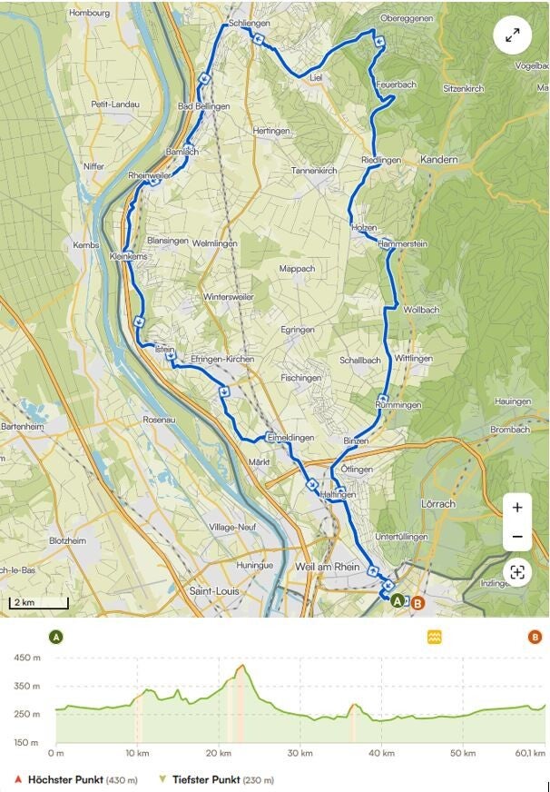 | Route | Riehen – Binzen – Holzen – Riedlingen – Feuerbach – Niedereggenen – Schliengen – Efringen – Eimeldingen - Riehen |